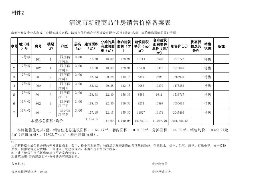 海伦堡海琴湾花园17号楼新建商品住房销售价格备案表.xls