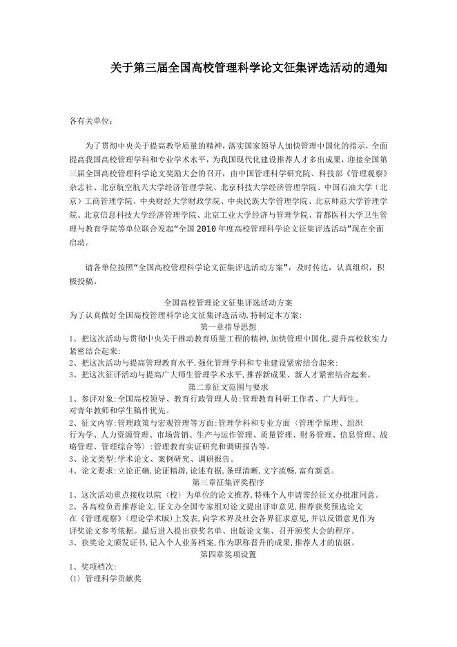 关于第三届全国高校管理科学论文征集评选活动的通知.doc