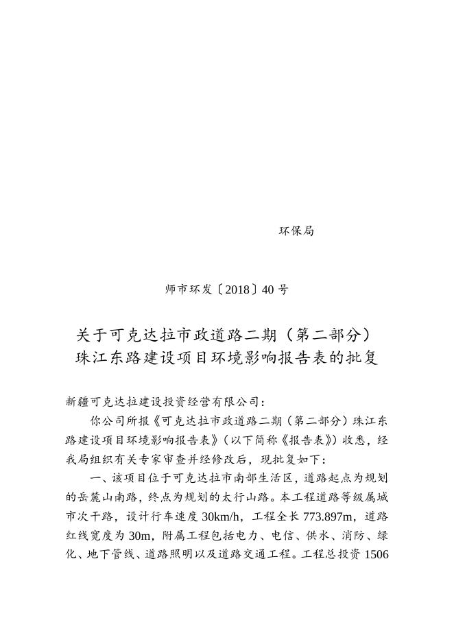 师市环发〔2018〕40号关于可克达拉市政道路二期(第二部分)珠江东路建设项目环境影响报告表的批复.doc