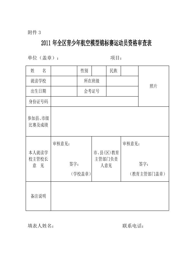 2011年全区青少年航空模型锦标赛运动员资格审查表.doc
