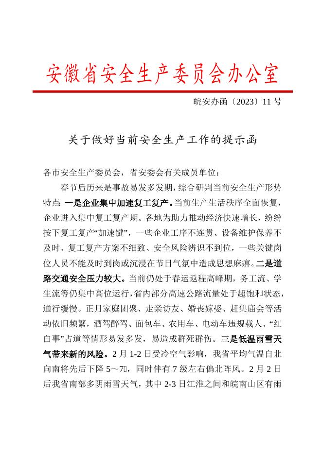 关于做好当前安全生产工作的提示函.doc