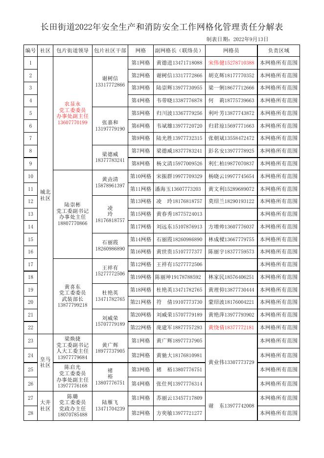 田政发〔2022〕8、9、10长田街道2022年安全生产和消防安全工作网格化管理责任分解表.xlsx