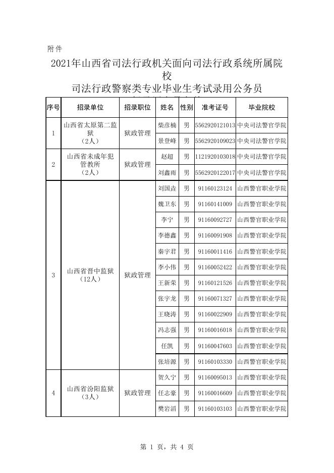附:2021年度山西省司法行政机关面向司法行政系统所属院校司法行政警察类专业毕业生考试录用公务员拟录用人员名单.xls