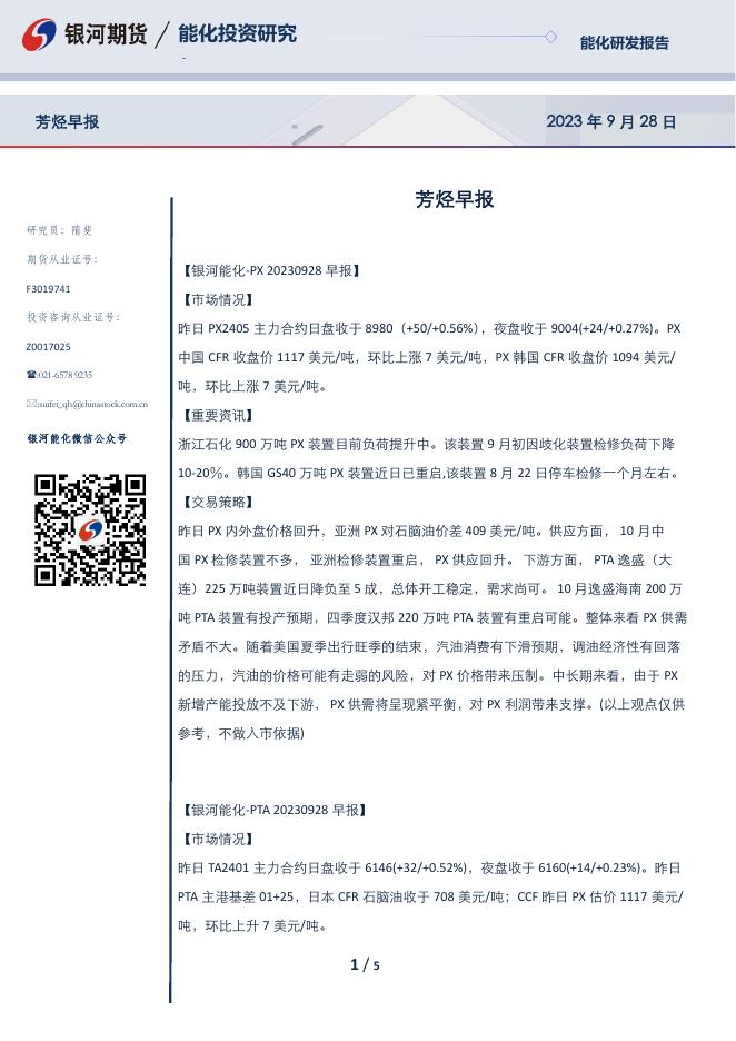 【银河期货】芳烃早报230928 - [品种]期货走势_[品种]期货行情_[品种]期货交易价格[报告页码]银河期货开户交易.pdf