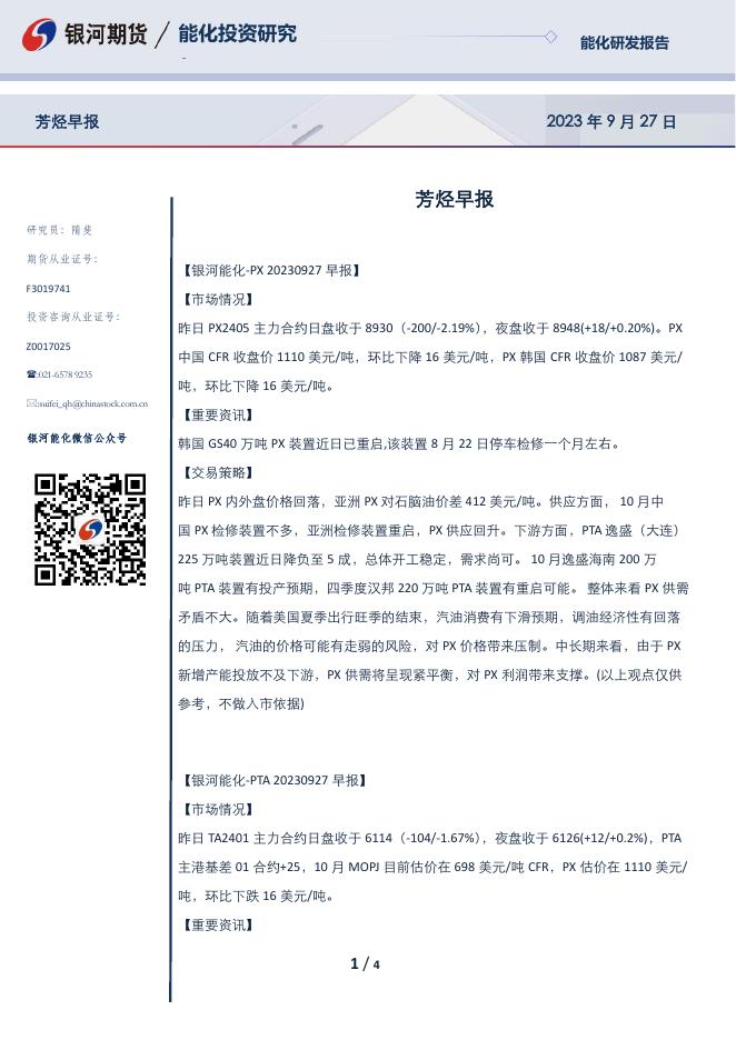 【银河期货】芳烃早报230927 - [品种]期货走势_[品种]期货行情_[品种]期货交易价格[报告页码]银河期货开户交易.pdf