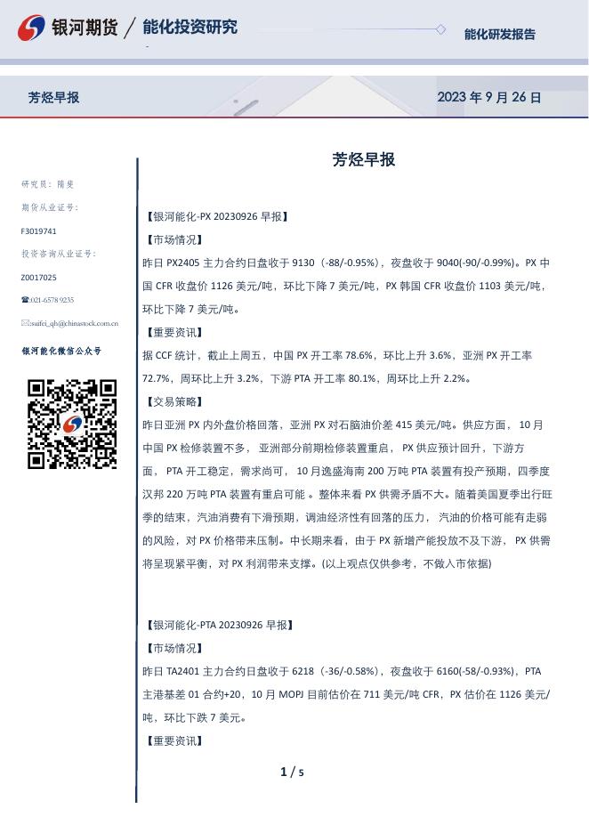 【银河期货】芳烃早报230926 - [品种]期货走势_[品种]期货行情_[品种]期货交易价格[报告页码]银河期货开户交易.pdf