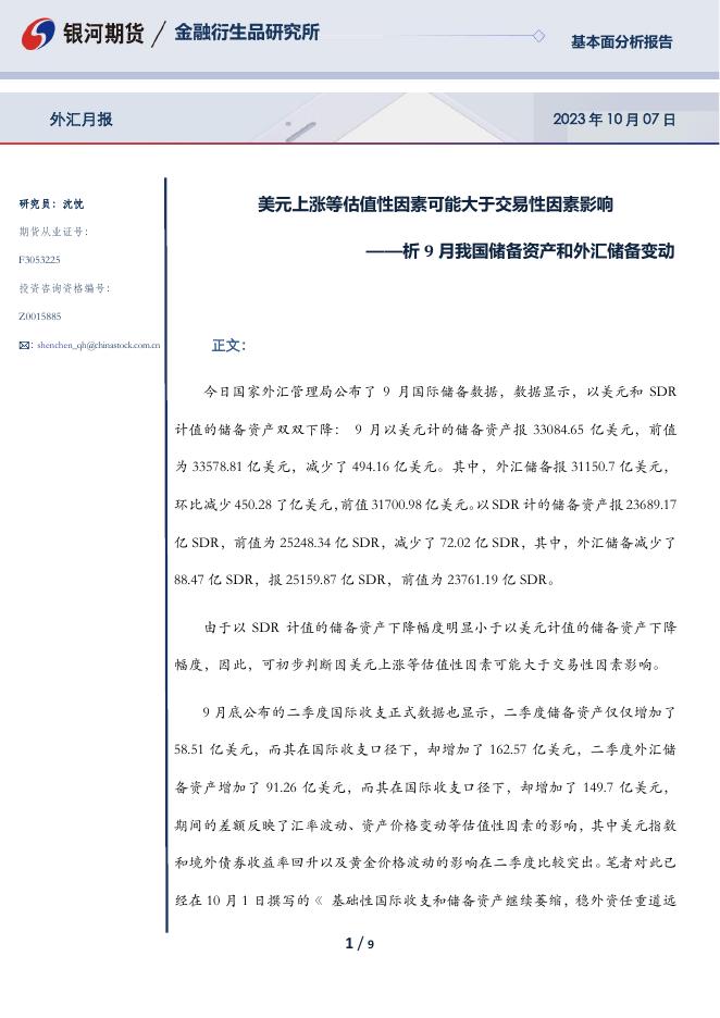 【银河期货】析9月我国储备资产和外汇储备变动 - [品种]期货走势_[品种]期货行情_[品种]期货交易价格[报告页码]银河期货开户交易.pdf
