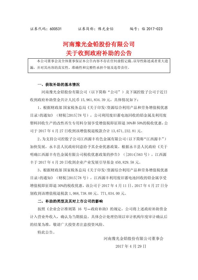 豫光金铅关于收到政府补助的公告2017-023 11 10,2017.pdf
