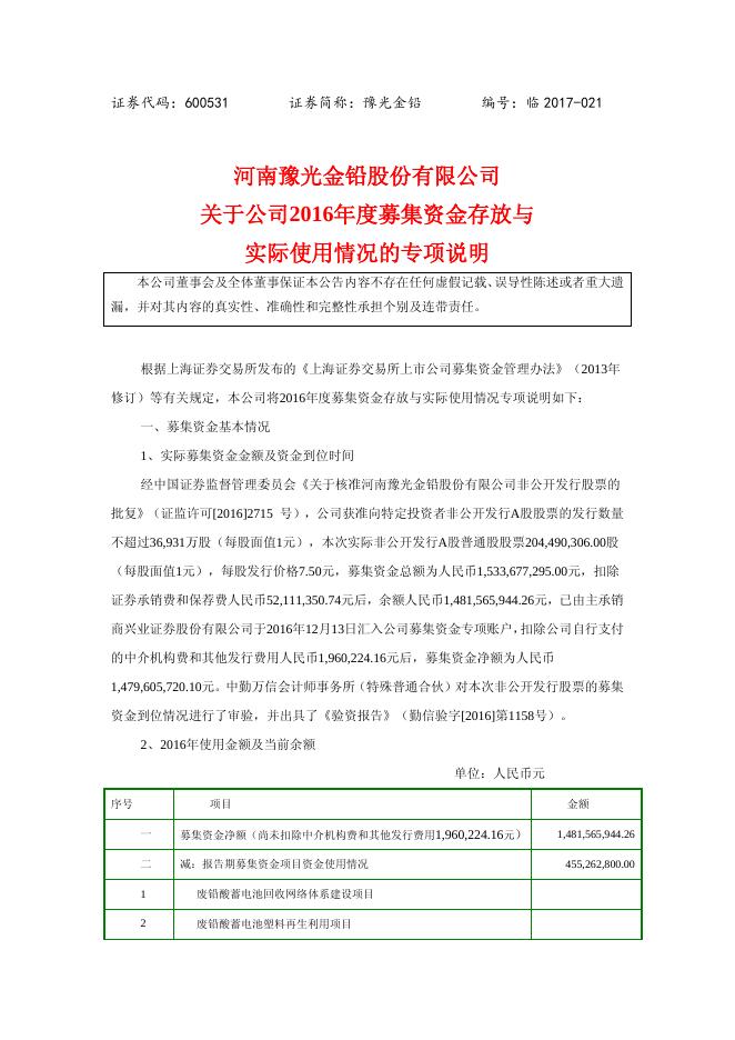 豫光金铅关于公司2016年度募集资金存放与实际使用情况的专项说明2017-021 11 10,2017.pdf