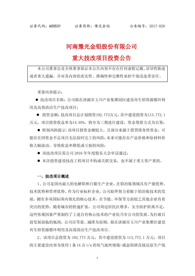 豫光金铅重大技改项目投资公告2017-020 11 10,2017.pdf