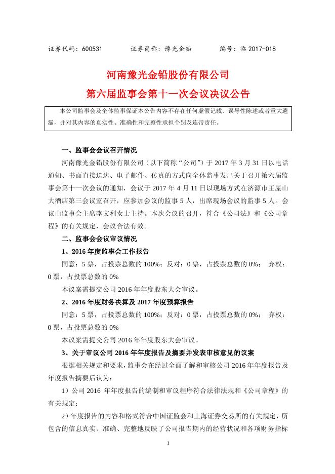 豫光金铅第六届监事会第十一次会议决议公告2017-018 11 10,2017.pdf