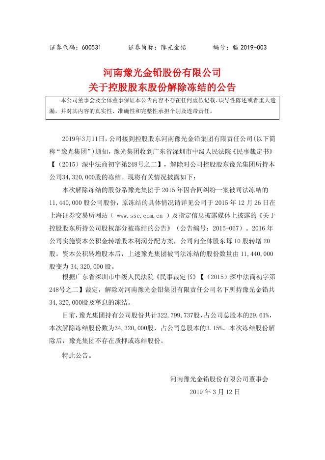 关于控股股东所持公司部分股权解除冻结的公告 12 03,2019.pdf