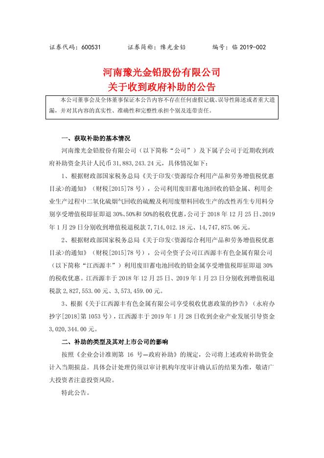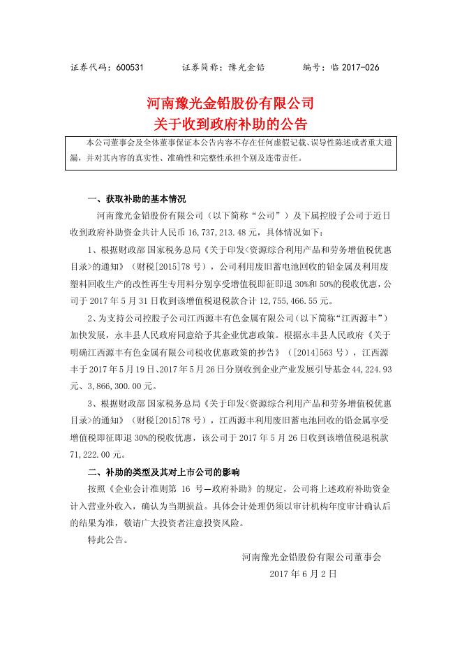 豫光金铅关于收到政府补助的公告2017-026 11 10,2017.pdf