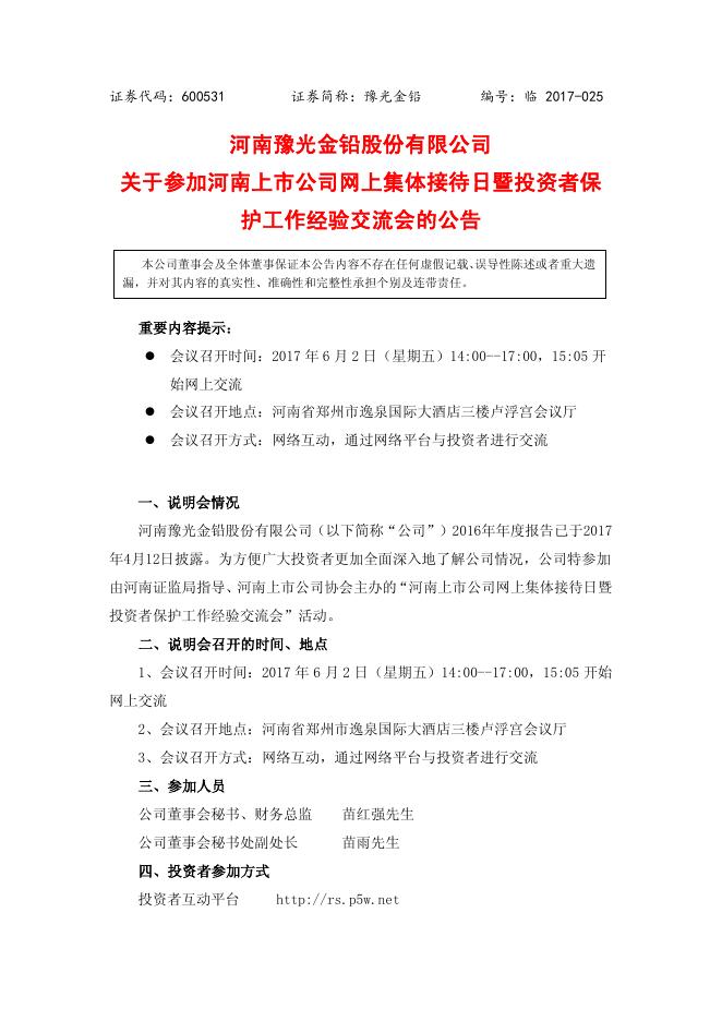 豫光金铅关于参加河南上市公司网上集体接待日暨投资者保护工作经验交流会的公告2017-025 11 10,2017.pdf