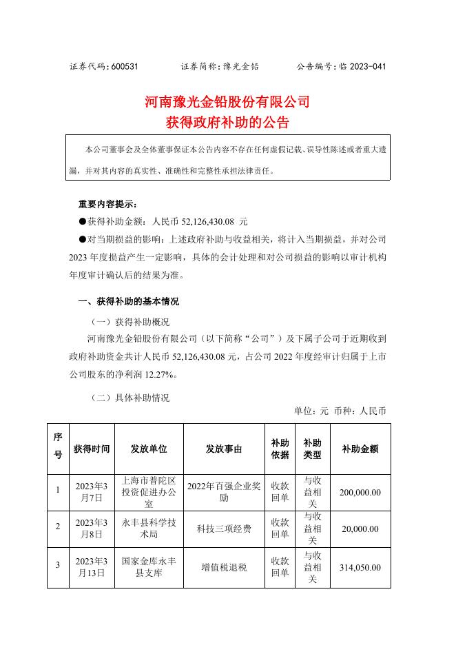 河南豫光金铅股份有限公司关于收到政府补助的公告 04 08,2023.pdf