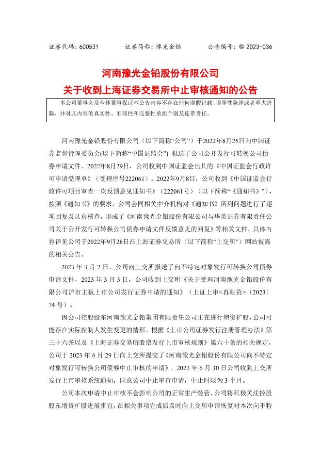 河南豫光金铅股份有限公司关于收到上海证券交易所中止审核通知的公告 04 08,2023.pdf