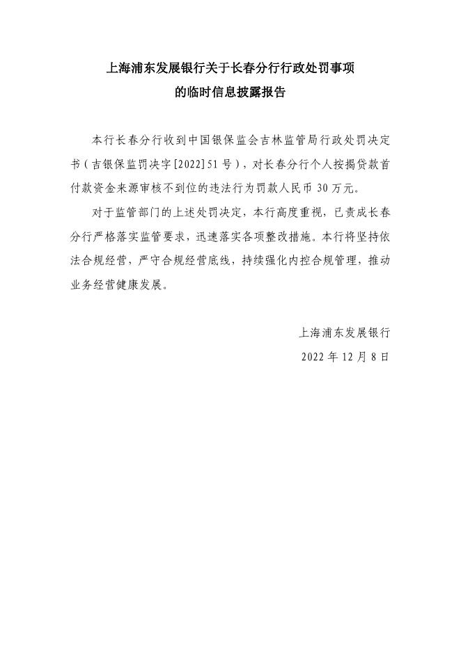上海浦东发展银行关于长春分行行政处罚事项的临时信息披露报告.pdf