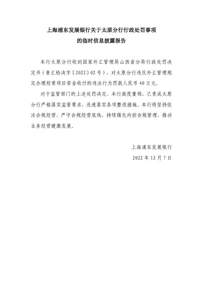 上海浦东发展银行关于太原分行行政处罚事项的临时信息披露报告.pdf