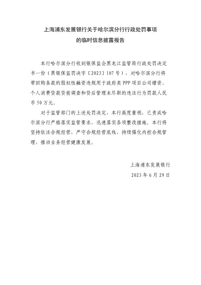 上海浦东发展银行关于哈尔滨分行行政处罚事项的临时信息披露报告.pdf