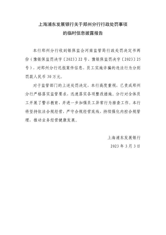 上海浦东发展银行关于郑州分行行政处罚事项的临时信息披露报告.pdf