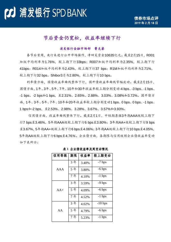 节后资金仍宽松,收益率继续下行(20190218).pdf