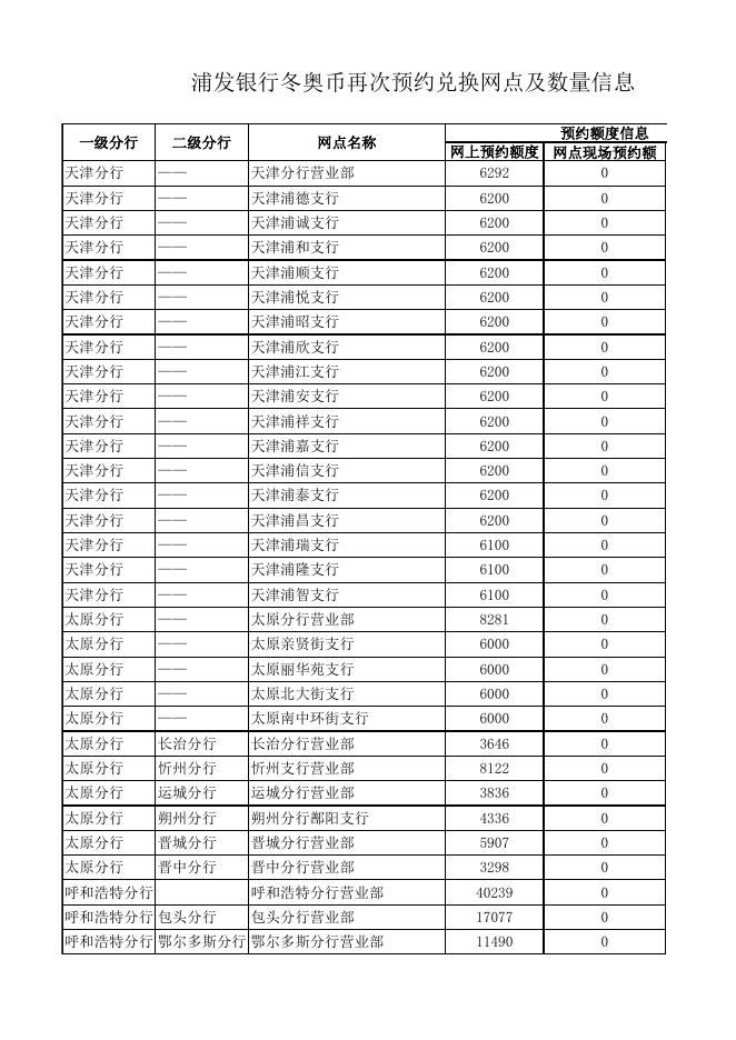 附件1:浦发银行冬奥币再次预约兑换网点及数量信息.xls