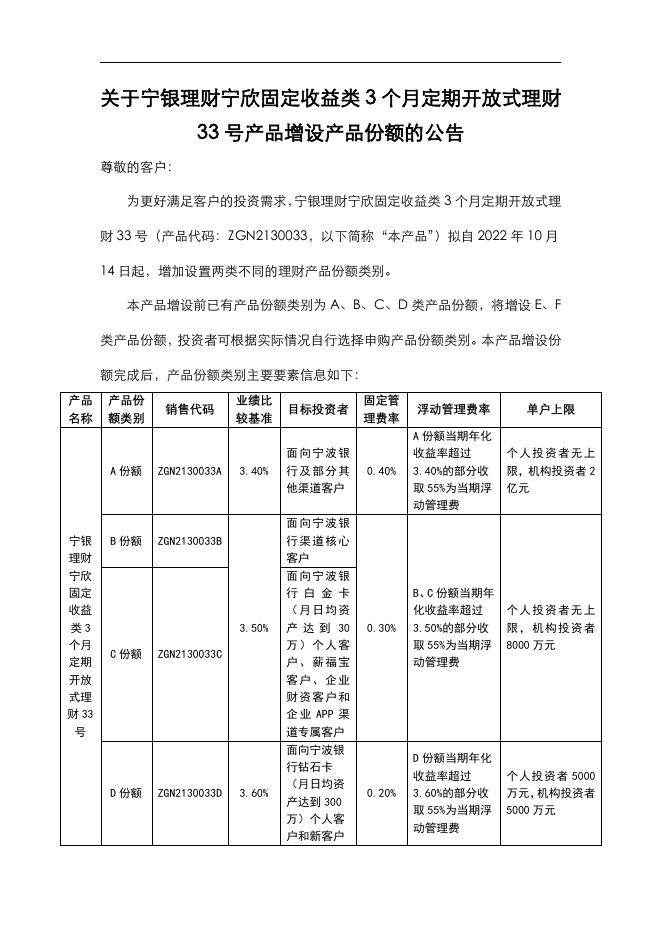 关于宁银理财宁欣固定收益类3个月定期开放式33号产品增设产品份额的公告.pdf
