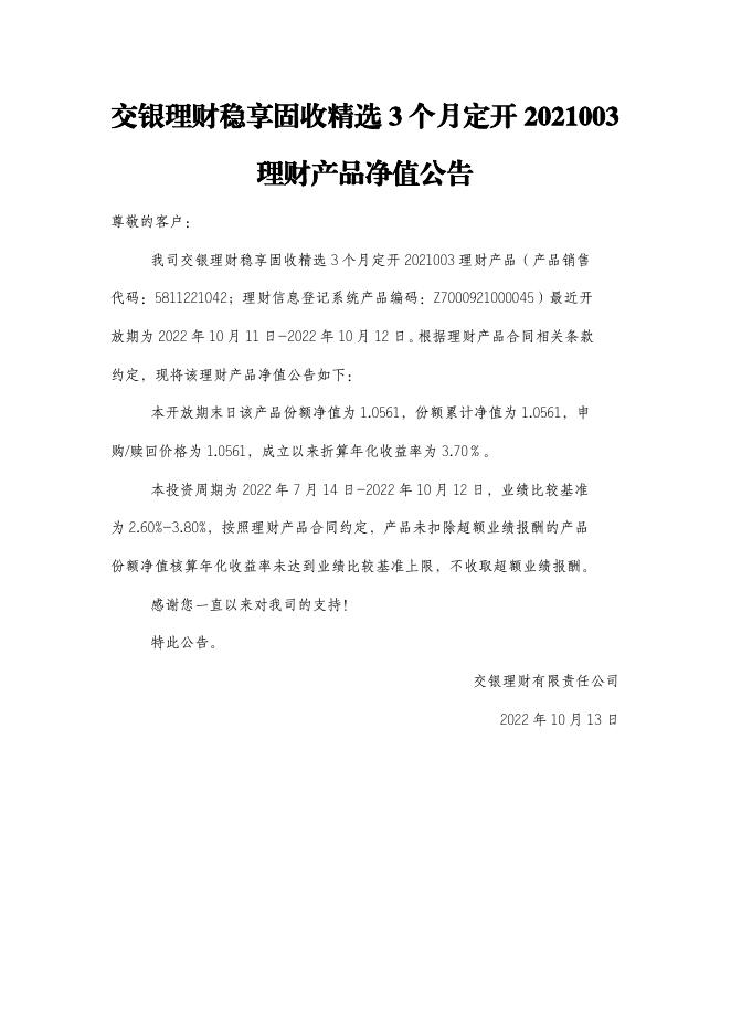 交银理财稳享固收精选3个月定开2021003理财产品净值公告(2022年10月13日).pdf
