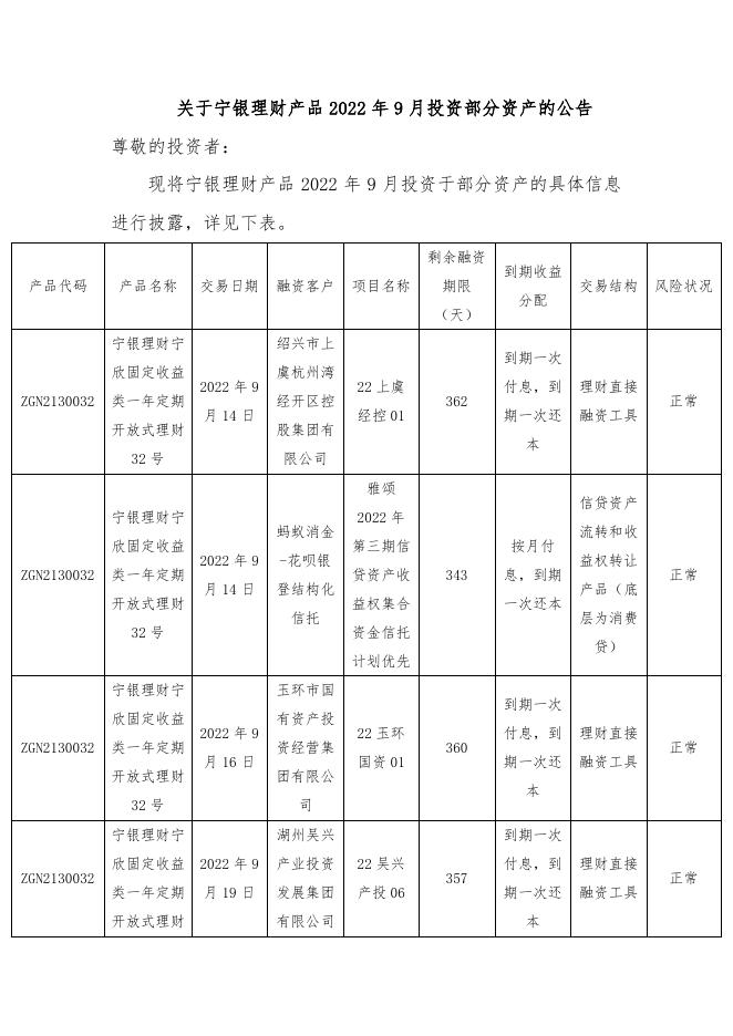 关于宁银理财产品2022年9月投资部分资产的公告.pdf