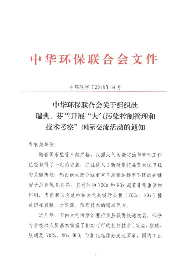 关于组织赴瑞典、芬兰开展“大气污染控制管理研修和技术考察”国际交流活动的通知 - 中华环保联合会VOCs污染防治专业委员会.pdf