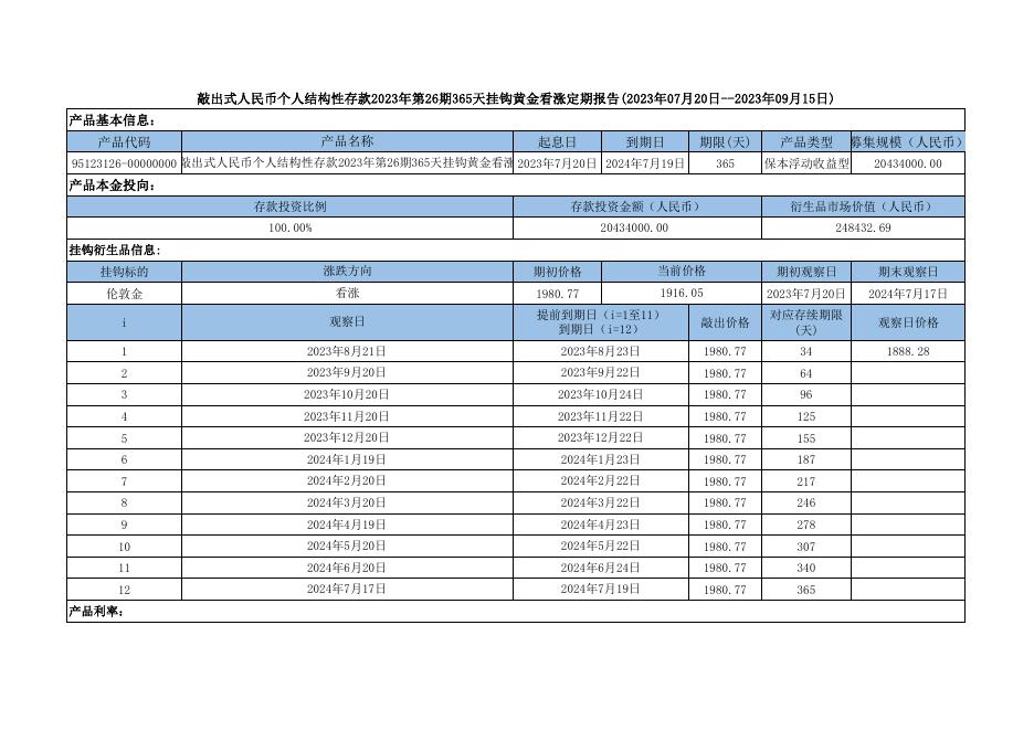 敲出式人民币个人结构性存款2023年第26期365天挂钩黄金看涨运作公告(2023年07月pdf