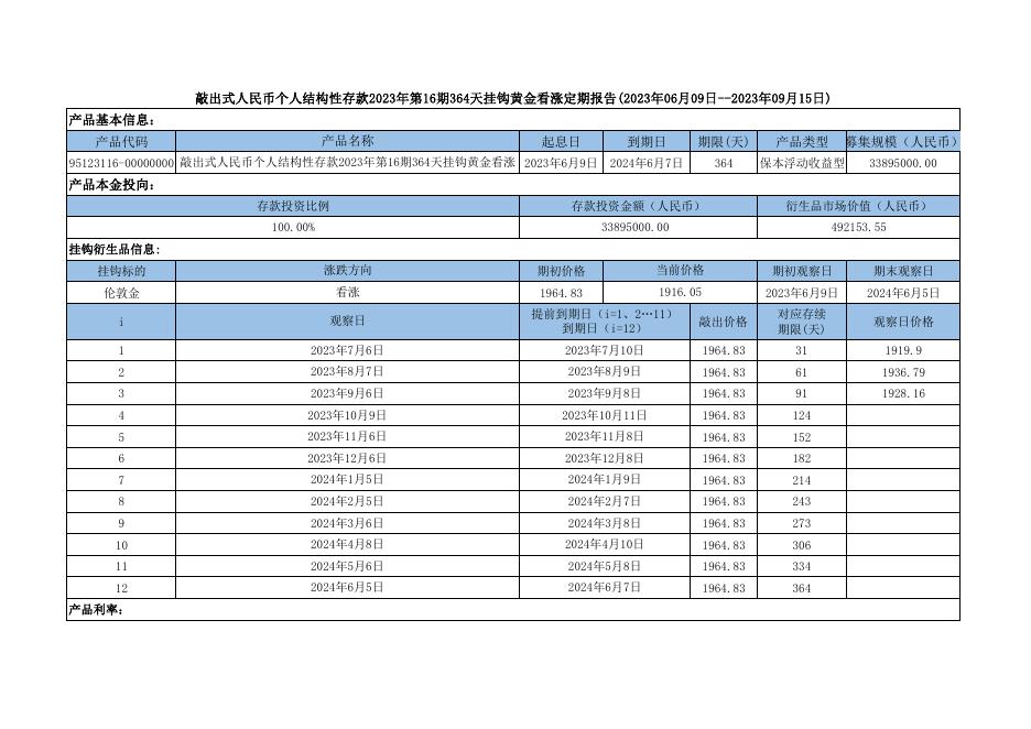 敲出式人民币个人结构性存款2023年第16期364天挂钩黄金看涨运作公告(2023年06月pdf