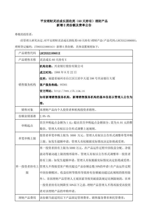 平安理财灵活成长固收类(60天持有)理财产品新增E类份额及费率公告.pdf