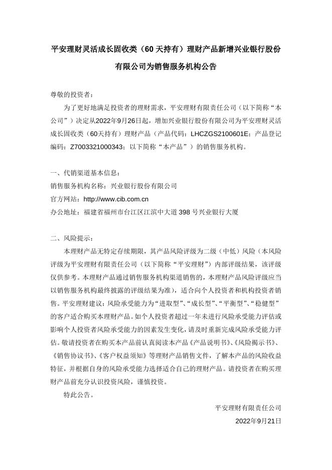 平安理财灵活成长固收类(60天持有)理财产品新增兴业银行股份有限公司为销售服务机构公告.pdf