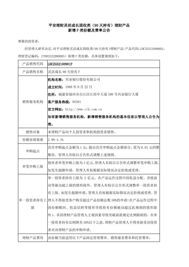 平安理财灵活成长固收类(90天持有)理财产品新增F类份额及费率公告.pdf