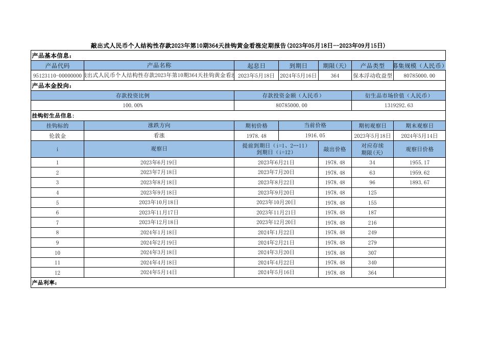 敲出式人民币个人结构性存款2023年第10期364天挂钩黄金看涨运作公告(2023年05月pdf