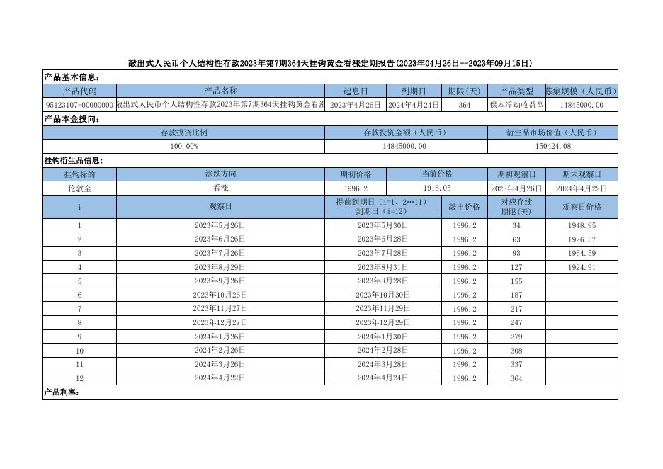 敲出式人民币个人结构性存款2023年第7期364天挂钩黄金看涨运作公告(2023年04月2pdf