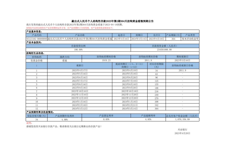 敲出式人民币个人结构性存款2023年第2期364天挂钩黄金看涨到期公告-95123102-pdf