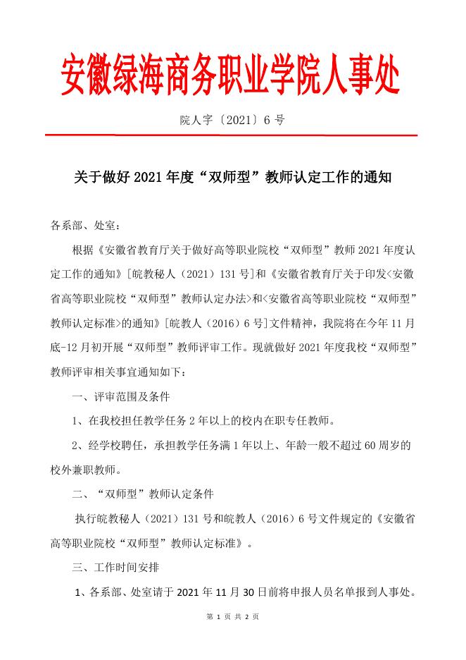 关于做好2021年度“双师型”教师认定工作的通知 - 安徽绿海商务职业学院.pdf