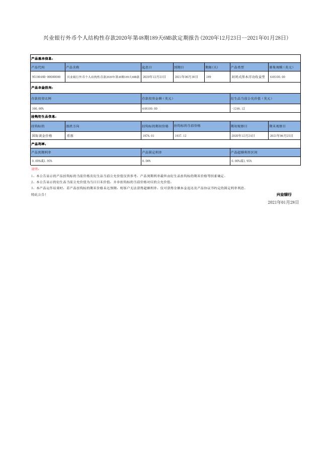 兴业银行外币个人结构性存款2020年第48期189天6MB款运作公告(2020年12月23pdf