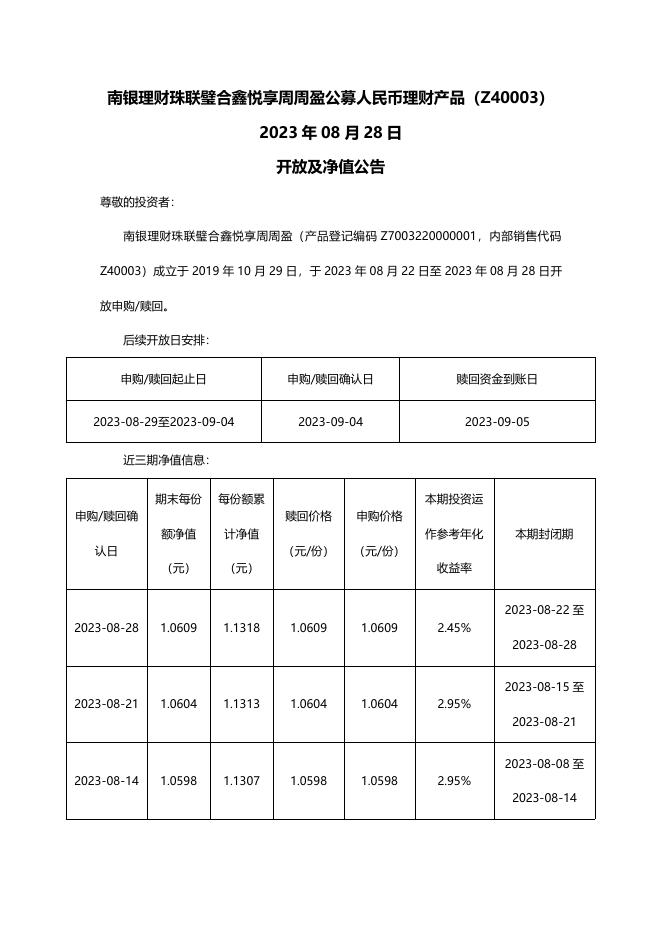 南银理财珠联璧合鑫悦享周周盈公募人民币理财产品(Z40003)2023年08月28日开放及净值公告Z40003.pdf