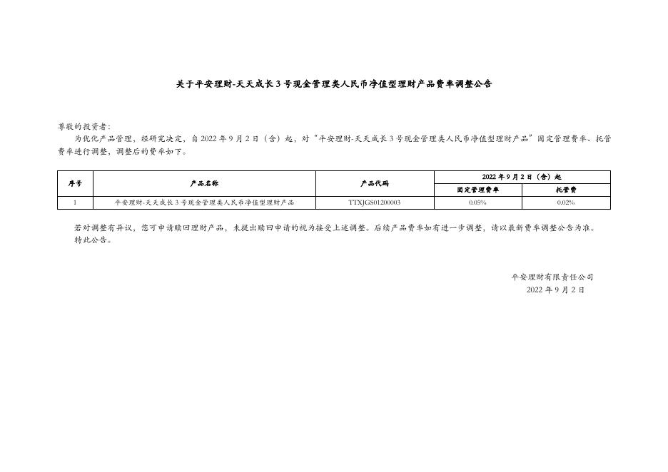 关于平安理财-天天成长3号现金管理类人民币净值型理财产品费率调整公告.pdf