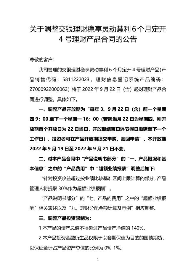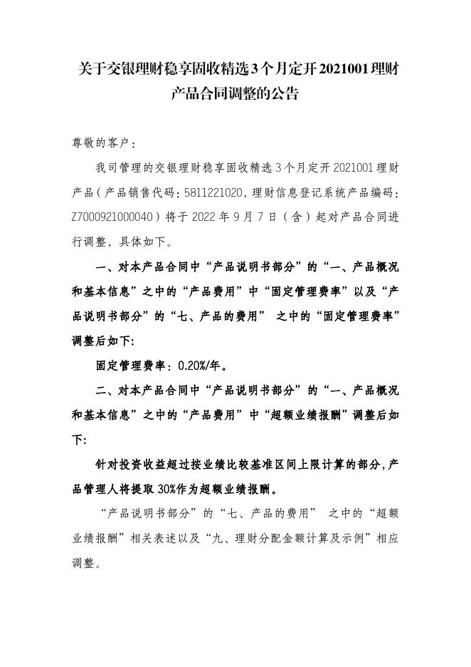关于交银理财稳享固收精选3个月定开2021001理财产品合同调整的公告(2022年9月1日).pdf