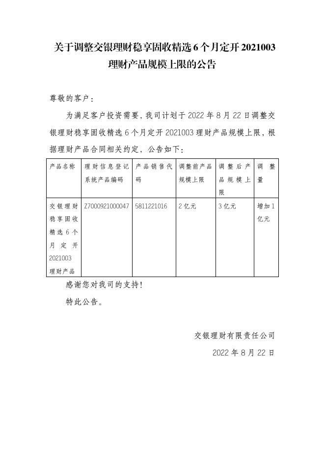 关于调整交银理财稳享固收精选6个月定开2021003理财产品规模上限的公告(兴业银行代销,2022年8月22日) (1).pdf