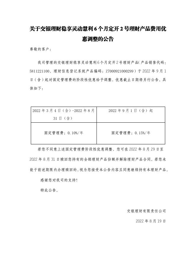 关于交银理财稳享灵动慧利6个月定开2号理财产品费用优惠调整的公告(2022年8月19日).pdf