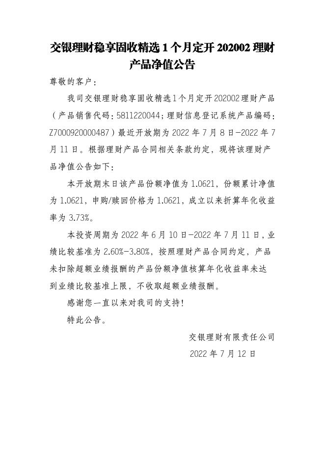 交银理财稳享固收精选1个月定开202002理财产品净值公告(2022年7月12日).pdf
