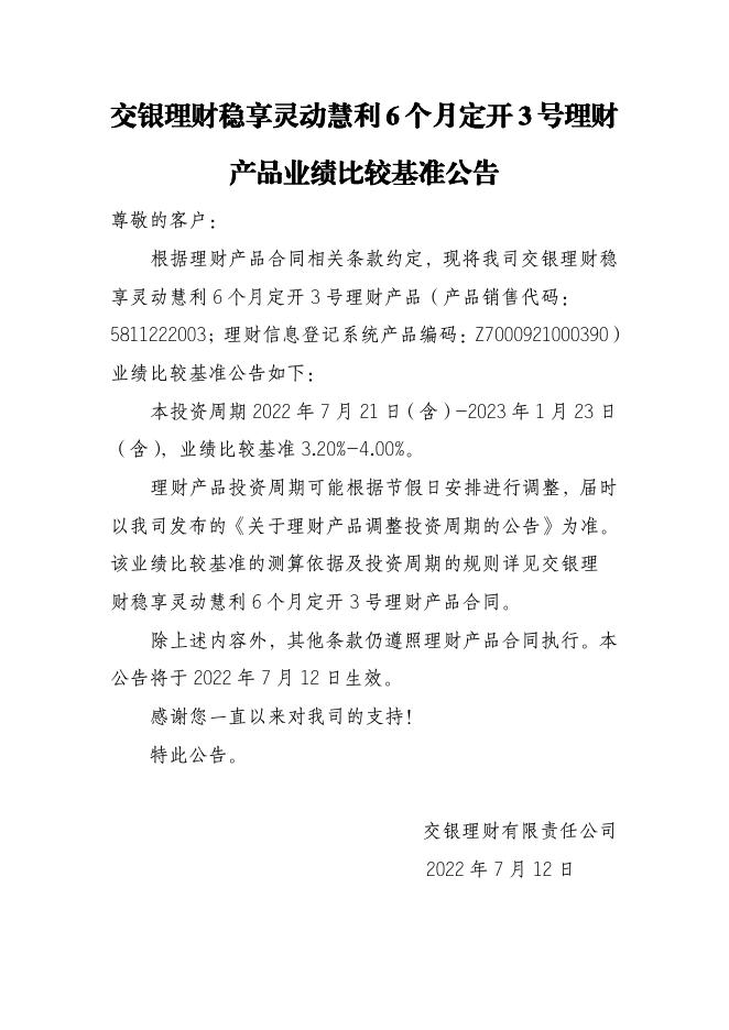 交银理财稳享灵动慧利6个月定开3号理财产品业绩比较基准公告(2022年7月12日).pdf