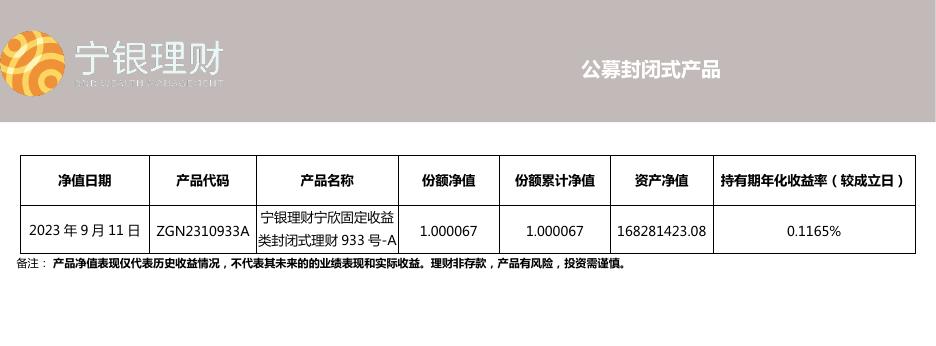 宁银理财宁欣固定收益类封闭式理财933号-A_净值披露_20230912.pdf