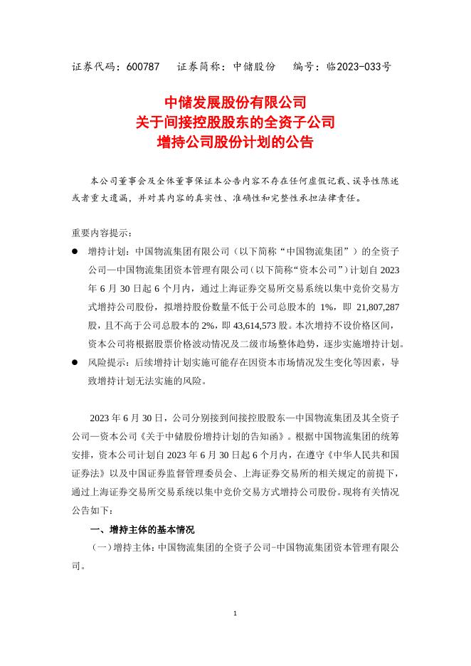 600787_20230701_中储发展股份有限公司关于间接控股股东的全资子公司增持公司股份计划的公告.pdf