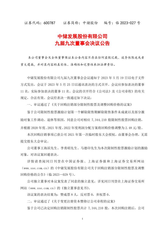 600787_20230526_中储发展股份有限公司九届九次董事会决议公告.pdf